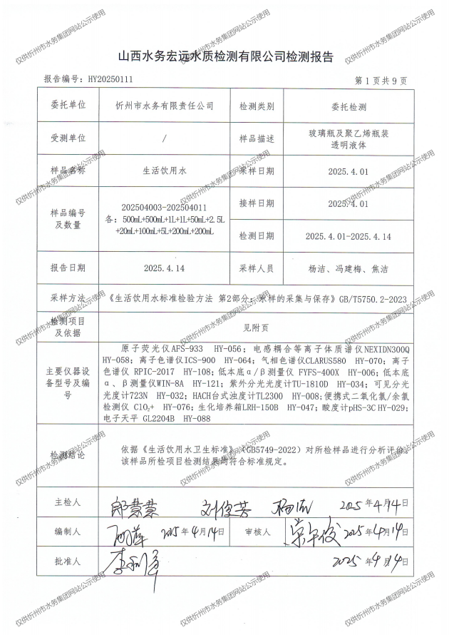 忻州城區(qū)公共供水水源水、出廠水、管網(wǎng)水、管網(wǎng)末梢水2025年4月份水質(zhì)信息公示